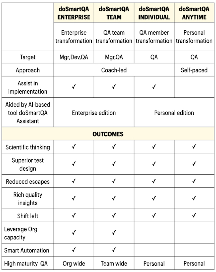 | doSmartQA ENTERPRISE | doSmartQA TEAM | doSmartQA INDIVIDUAL | doSmartQA Anytime | |