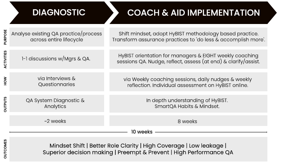 Spread over 10 weeks with key outcomes of shift in mindset, high coverage, lowering leakage for High Performance QA, it consists of TWO phases with well laid transformation activities as outlined in the picture.